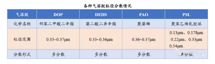 在安装高效过滤器后的现场检查中,实际上不可能使用MPPS方法。 只有粒径接近 MPPS 粒径的气溶胶才能用于检测泄漏。 而对于多分散气溶胶,要注意是使用几何平均粒径还是质量平均粒径。 目前常用的气溶胶及其粒径范围见下表。